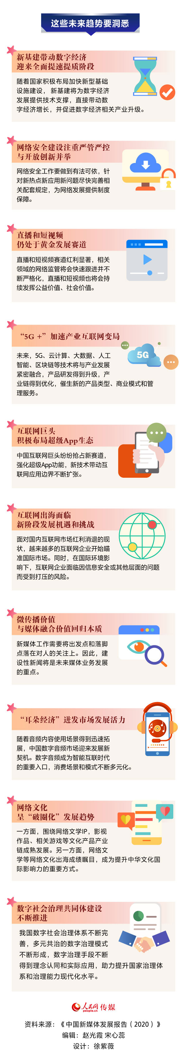 7月22日,新媒体蓝皮书《中国新媒体发展报告( 2020)》正式对外发布。站在5G商用元年的新起点上,我国网络和新媒体发展呈现出什么发展状况?又有哪些研究发现?未来有何趋势走向?人民网传媒频道带你一图纵览我国新媒体发展图景。