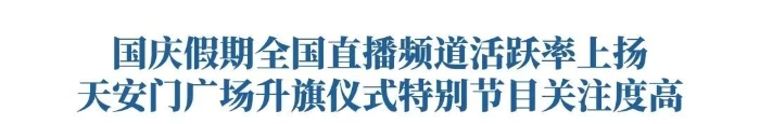 10月1日至8日,全国直播频道日均活跃率环比上涨2.8%。国庆当天,CCTV-1、CCTV-13并机直播天安门广场升旗仪式《日出东方(国庆特别报道)》,综合收视率2.022%、收视份额37.225%。该节目在全国多个地区收获高关注度,其中在新疆、甘肃、内蒙古、贵州、云南、湖南6个地区收视份额超50%。当晚,CCTV-1、CCTV-3、CCTV-15并机播出《中国梦·家国情——2025国庆特别节目》,全国范围累计收视4425.6万人次,综合收视率4.149%、收视份额16.884%,位列同时段上星频道节目收视率第一。该节目在全国多地收获观众欢迎,在20个省区市收视份额超15%,其中9个省区市超20%。