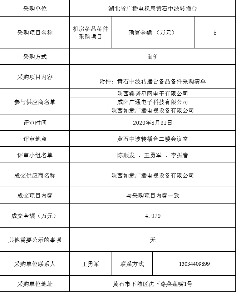各有关当事人对成交结果有异议的,可以在公告期内以实名、书面形式向湖北省广播电视局黄石中波转播台提出质疑,逾期将不再受理。