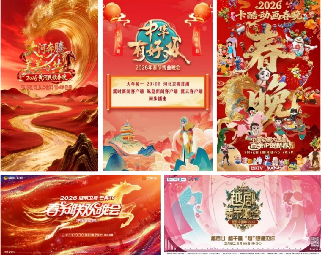 春节期间,广播电视与网络视听同频共振,大屏小屏各类精彩节目骏马驰屏、好戏连台。40多场特色春晚精彩纷呈,既有综合类晚会,也有歌舞、戏曲、相声、动画、民歌、少儿、老年、对农、丝路等丰富主题,从腊月二十三至元宵节轮番上映、精彩不停。中央广播电视总台《2026年春节联欢晚会》以“骐骥驰骋 势不可挡”为主题,在“欢乐吉祥、喜气洋洋”的主基调下,从中华优秀传统文化中汲取创意灵感,从新大众文艺的创新中吸纳创作养分,从开心、贴心、暖心、信心等多个角度持续打造“人民的春晚”。精心安排歌舞、戏曲、语言、魔术、创意融合等多类型节目,突出浓浓的年味,传递喜庆吉祥的色彩,赞美幸福的生活。《CMG第四届中国电视剧年度盛典》是一台致敬优秀剧目和主创的文艺晚会,将汇聚中国电视剧行业优秀的导演、编剧、演员,充分彰显国家主流媒体引领力、影响力。《2026年春节戏曲晚会》集结全国近80家文艺团体、30余个戏曲剧种,融合仙侠短剧、情景演绎、诗乐戏韵等多元形式,借助影视化叙事与数字特效,打造时尚感、年轻化的戏曲传播新样态。《2026年中央广播电视总台少儿春晚》聚焦“健康宝贝添新岁”主题,以“潮、酷、乐、燃”为风格基调,通过富有创意与温度的节目编排,展现新时代少年儿童健康活泼、自信昂扬的成长姿态。